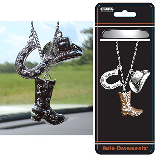 - Product Name: Silver Cowboy Hat and Horseshoe with Clear Gem Crystals and Brown Cowboy Boot Auto Car Truck SUV Vehicle Universal-fit Rear View Mirror Ornament - Auto Ornamentz